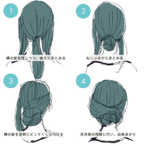 ピンだけ簡単 片よせ低めシニヨンヘアアレンジ イラスト付き ー髪のお悩みやケア方法の解決ならコラム Eparkビューティー イーパークビューティー
